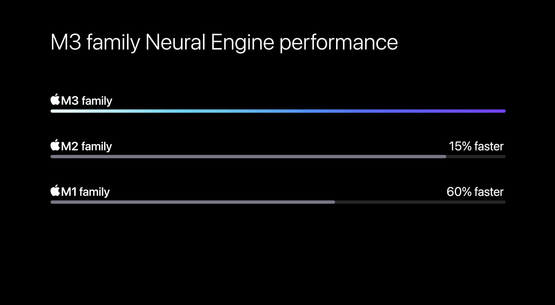 뉴럴 엔진(Neural Enging) 처리 속도는 M2보다 15%, M1보다는 60% 향상되었고, 특히 다이나맥 캐싱(Dynamc Caching)이라는 새로운 기술이 도입되면서 렌더링 속도가 M1 대비 최대 2.5배가 향상되었다.